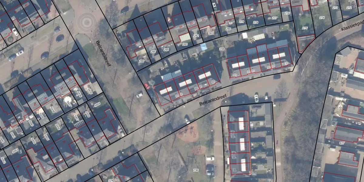 Het perceel waarop Belcantodreef 20 staat heeft een oppervlakte van 2348 m². Dit is een zeer groot perceel. De perceeloppervlakte wordt geregistreerd door het Kadaster. Gedetailleerde informatie over de maten van dit perceel kunt u vinden in het rapport Kadastrale kaart met maatvoering van Belcantodreef 20.