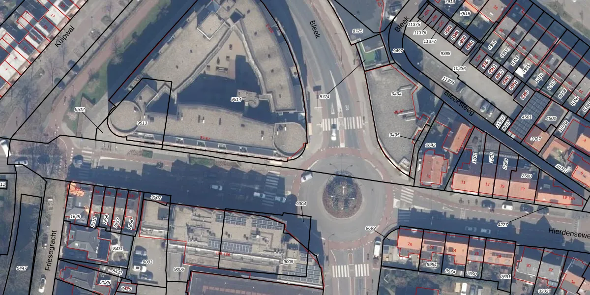 Het perceel waarop Bleek 102 staat heeft een oppervlakte van 2418 m². Dit is een zeer groot perceel. De perceeloppervlakte wordt geregistreerd door het Kadaster. Gedetailleerde informatie over de maten van dit perceel kunt u vinden in het rapport Kadastrale kaart met maatvoering van Bleek 102.