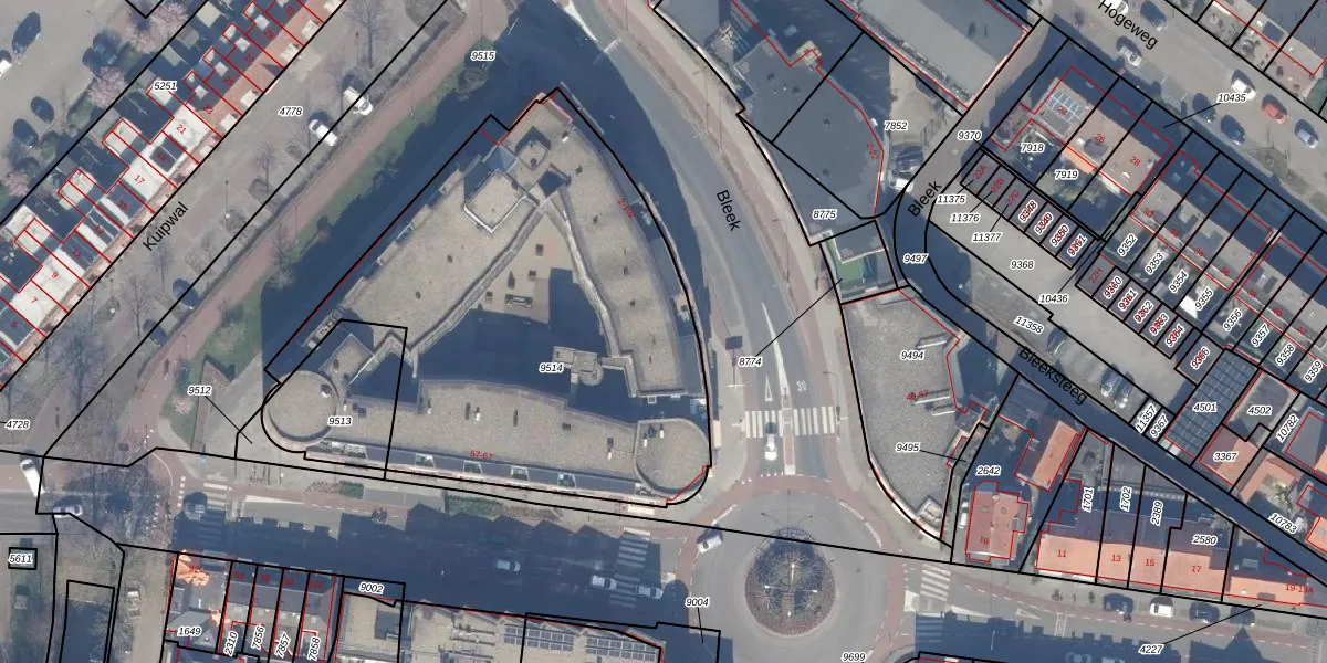 Het perceel waarop Bleek 12 staat heeft een oppervlakte van 2418 m². Dit is een zeer groot perceel. De perceeloppervlakte wordt geregistreerd door het Kadaster. Gedetailleerde informatie over de maten van dit perceel kunt u vinden in het rapport Kadastrale kaart met maatvoering van Bleek 12.