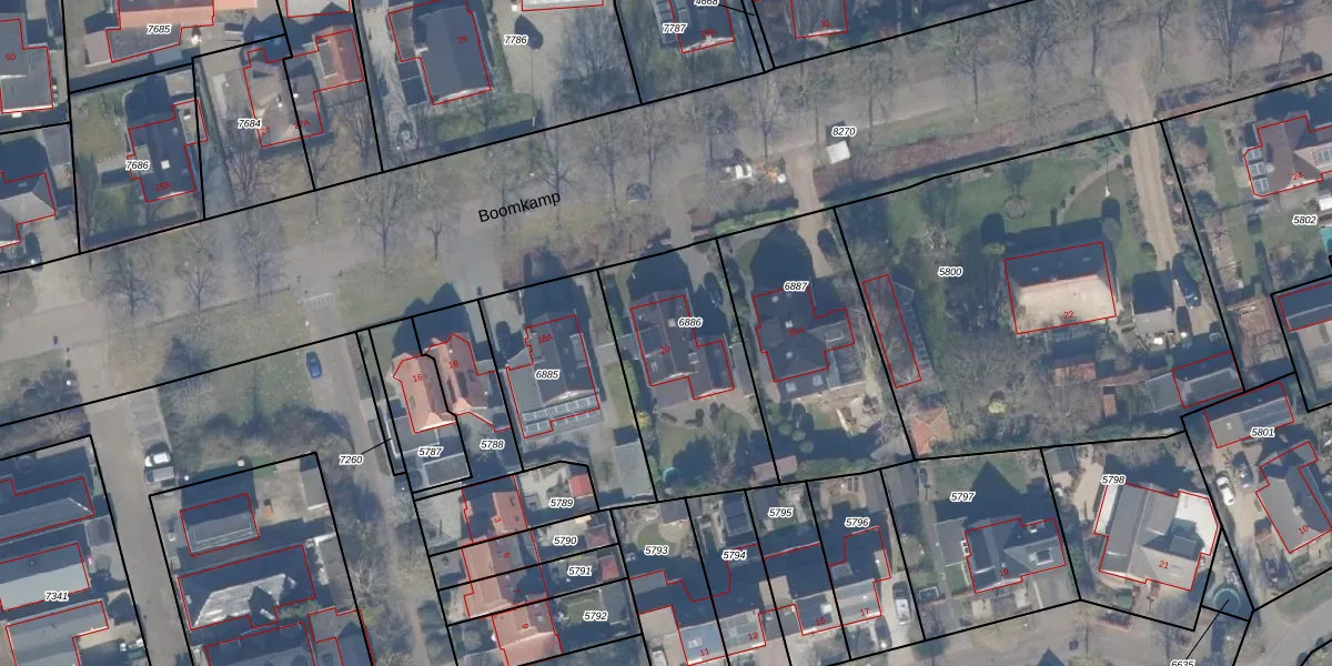 Het perceel waarop Boomkamp 20 staat heeft een oppervlakte van 690 m². Dit is een groot perceel. De perceeloppervlakte wordt geregistreerd door het Kadaster. Gedetailleerde informatie over de maten van dit perceel kunt u vinden in het rapport Kadastrale kaart met maatvoering van Boomkamp 20.