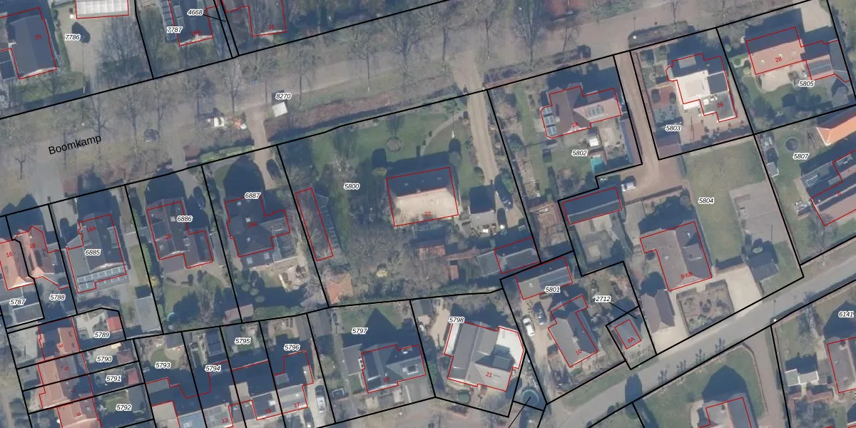 Boomkamp 22 is gelegen op kadastraal perceel HDW00B5800. Deze kadastrale aanduiding is uniek en wordt gebruikt door het Kadaster om eigendomsrechten en andere zakelijke rechten vast te leggen. Het perceel maakt onderdeel uit van de kadastrale gemeente Harderwijk.