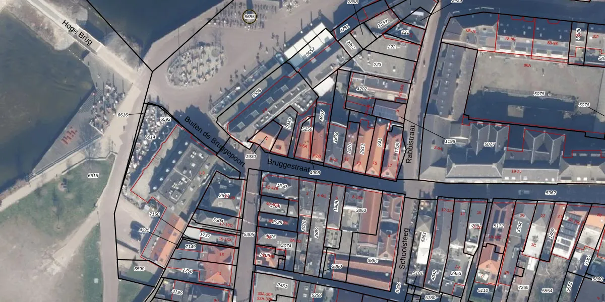 Het perceel waarop Bruggestraat 5 staat heeft een oppervlakte van 56 m². Dit is een klein perceel. De perceeloppervlakte wordt geregistreerd door het Kadaster. Gedetailleerde informatie over de maten van dit perceel kunt u vinden in het rapport Kadastrale kaart met maatvoering van Bruggestraat 5.