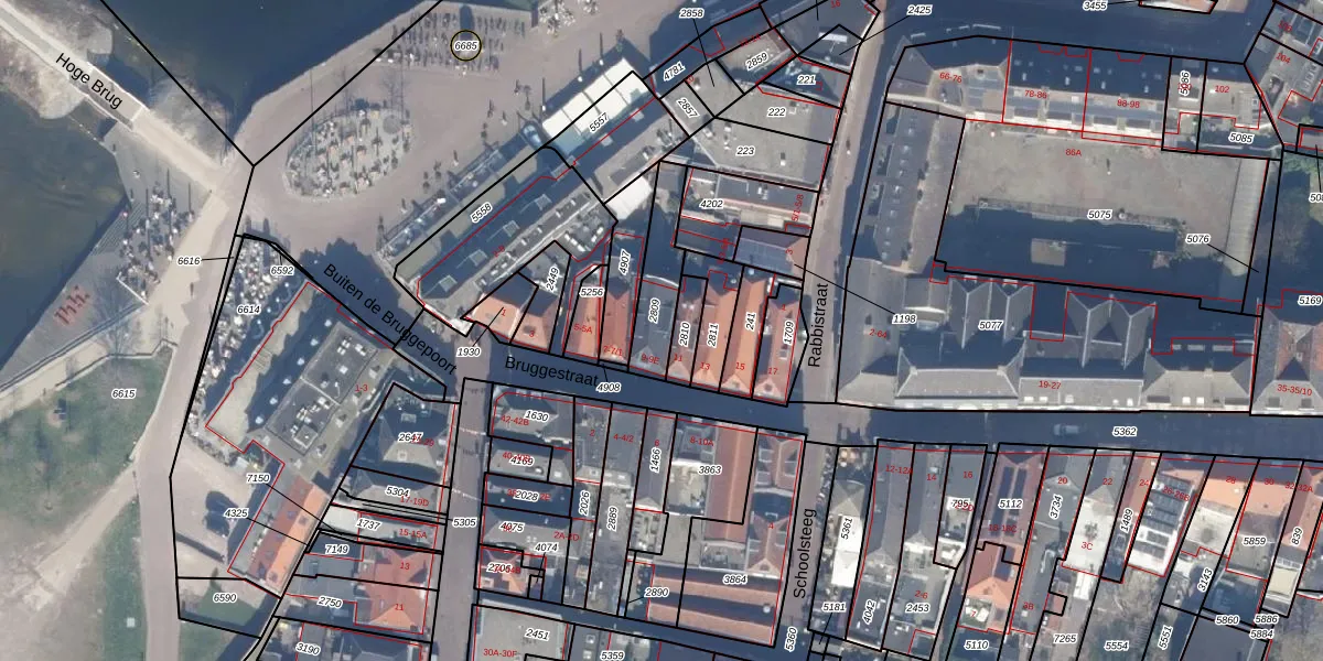Het perceel waarop Bruggestraat 9-C staat heeft een oppervlakte van 165 m². Dit is een middelgroot perceel. De perceeloppervlakte wordt geregistreerd door het Kadaster. Gedetailleerde informatie over de maten van dit perceel kunt u vinden in het rapport Kadastrale kaart met maatvoering van Bruggestraat 9-C.
