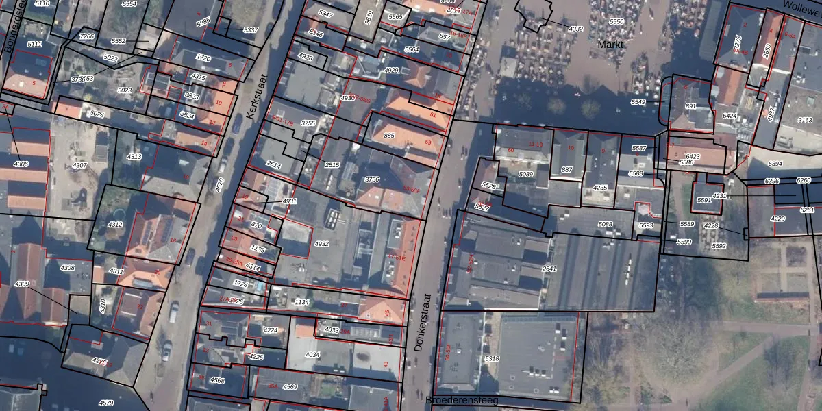 Donkerstraat 53 is gelegen op kadastraal perceel HDW00E3756. Deze kadastrale aanduiding is uniek en wordt gebruikt door het Kadaster om eigendomsrechten en andere zakelijke rechten vast te leggen. Het perceel maakt onderdeel uit van de kadastrale gemeente Harderwijk.