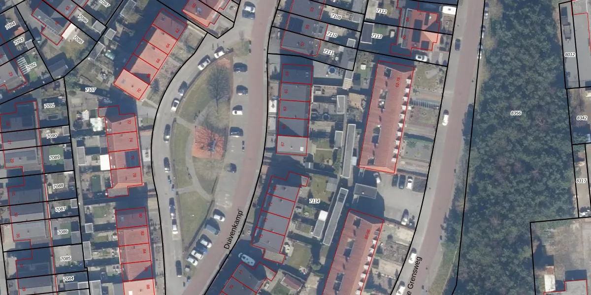 Het perceel waarop Duivenkamp 67 staat heeft een oppervlakte van 8545 m². Dit is een zeer groot perceel. De perceeloppervlakte wordt geregistreerd door het Kadaster. Gedetailleerde informatie over de maten van dit perceel kunt u vinden in het rapport Kadastrale kaart met maatvoering van Duivenkamp 67.