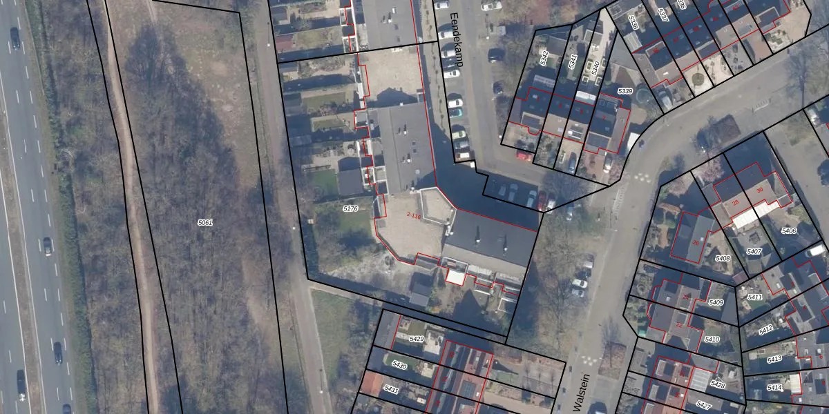 Het perceel waarop Eendekamp 88 staat heeft een oppervlakte van 2882 m². Dit is een zeer groot perceel. De perceeloppervlakte wordt geregistreerd door het Kadaster. Gedetailleerde informatie over de maten van dit perceel kunt u vinden in het rapport Kadastrale kaart met maatvoering van Eendekamp 88.