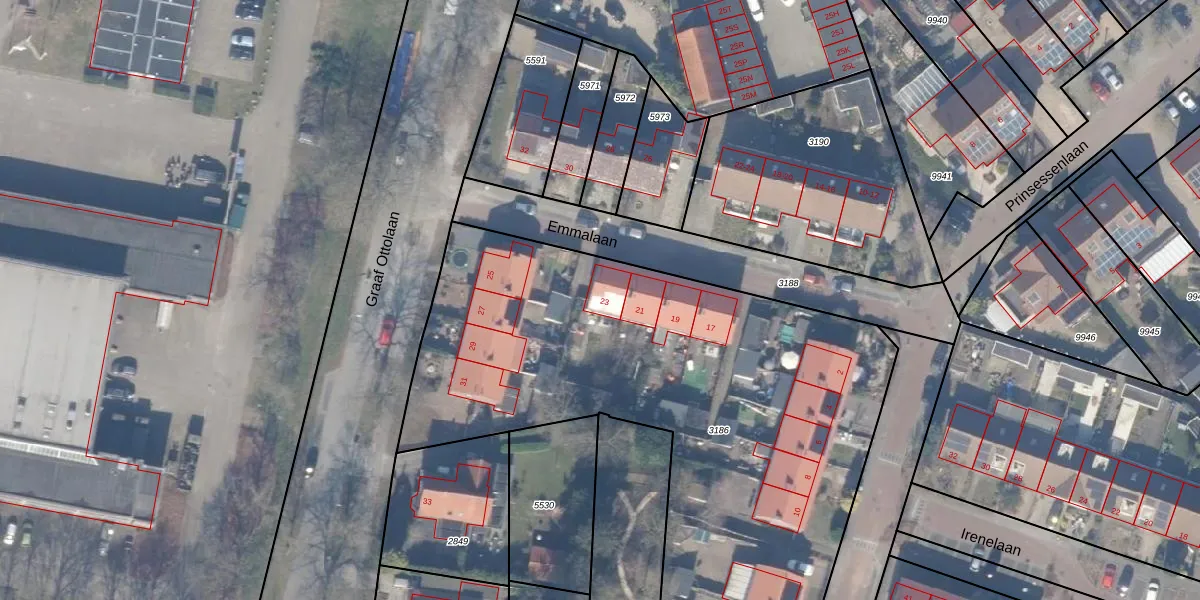 Het perceel waarop Emmalaan 23 staat heeft een oppervlakte van 3425 m². Dit is een zeer groot perceel. De perceeloppervlakte wordt geregistreerd door het Kadaster. Gedetailleerde informatie over de maten van dit perceel kunt u vinden in het rapport Kadastrale kaart met maatvoering van Emmalaan 23.