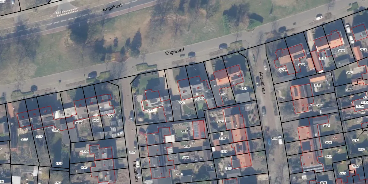 Het perceel waarop Engelserf 17 staat heeft een oppervlakte van 355 m². Dit is een groot perceel. De perceeloppervlakte wordt geregistreerd door het Kadaster. Gedetailleerde informatie over de maten van dit perceel kunt u vinden in het rapport Kadastrale kaart met maatvoering van Engelserf 17.