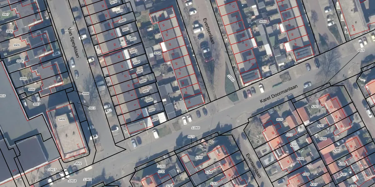 Het perceel waarop Evertsenlaan 30 staat heeft een oppervlakte van 2107 m². Dit is een zeer groot perceel. De perceeloppervlakte wordt geregistreerd door het Kadaster. Gedetailleerde informatie over de maten van dit perceel kunt u vinden in het rapport Kadastrale kaart met maatvoering van Evertsenlaan 30.