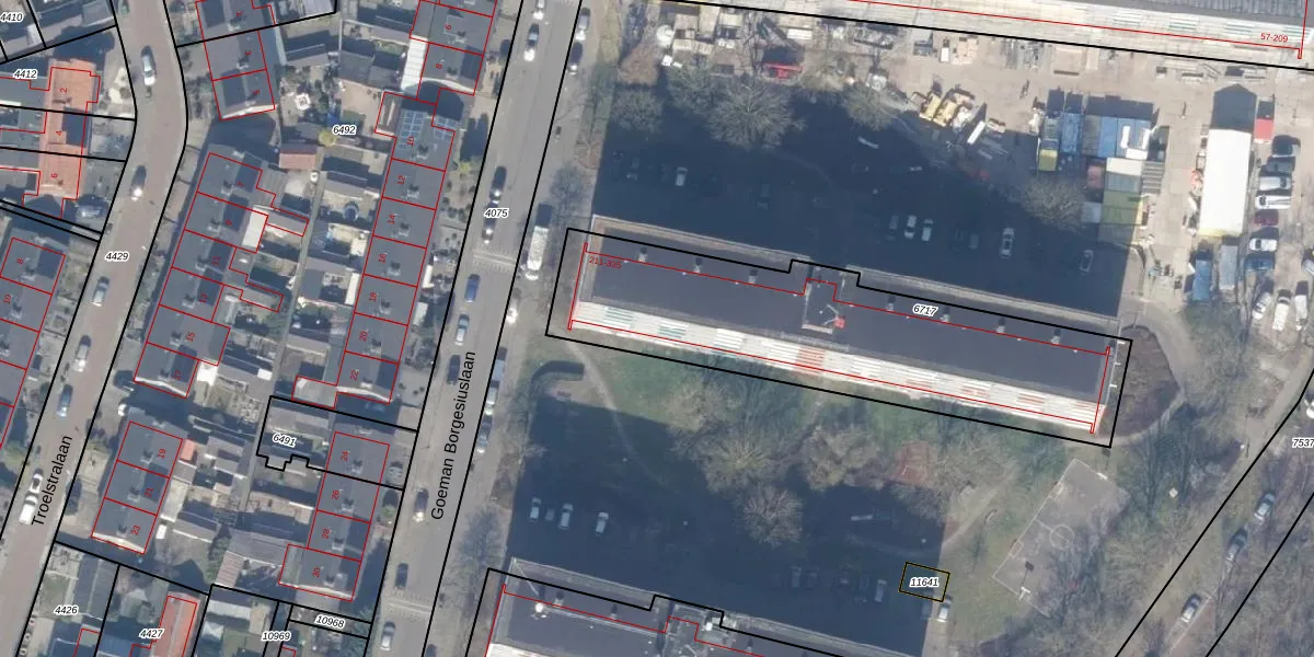 Het perceel waarop Goeman Borgesiuslaan 321 staat heeft een oppervlakte van 1475 m². Dit is een zeer groot perceel. De perceeloppervlakte wordt geregistreerd door het Kadaster. Gedetailleerde informatie over de maten van dit perceel kunt u vinden in het rapport Kadastrale kaart met maatvoering van Goeman Borgesiuslaan 321.