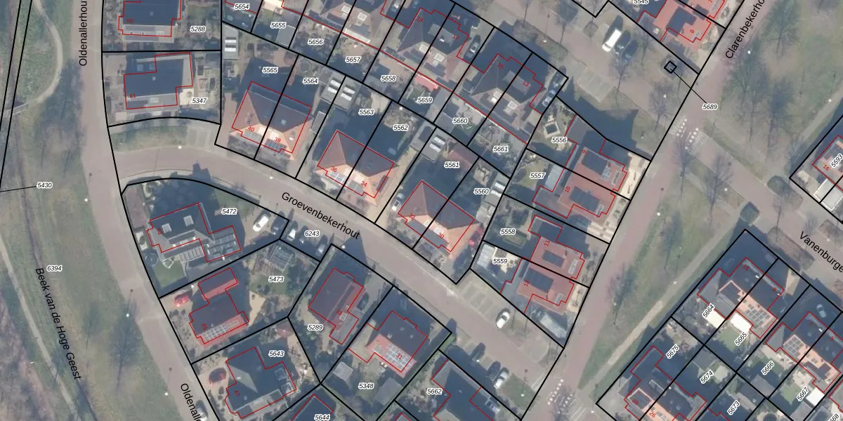 Het perceel waarop Groevenbekerhout 32 staat heeft een oppervlakte van 318 m². Dit is een groot perceel. De perceeloppervlakte wordt geregistreerd door het Kadaster. Gedetailleerde informatie over de maten van dit perceel kunt u vinden in het rapport Kadastrale kaart met maatvoering van Groevenbekerhout 32.