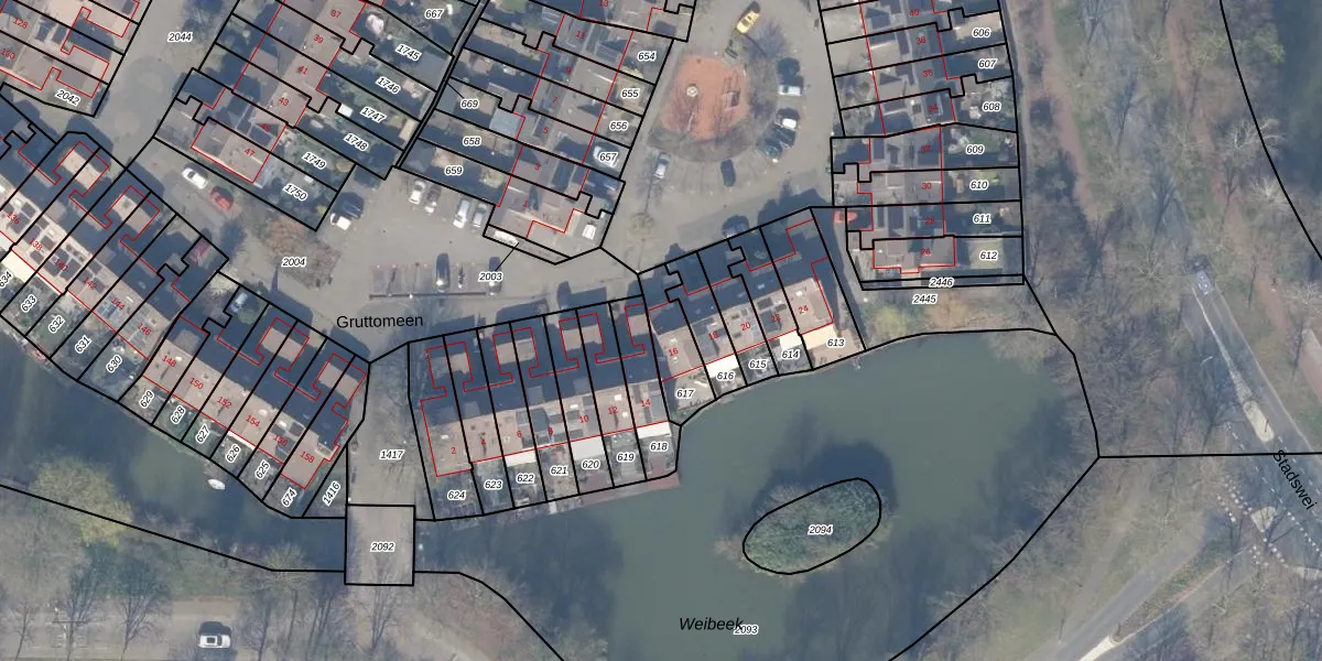 Gruttomeen 16 is gelegen op kadastraal perceel HDW00F617. Deze kadastrale aanduiding is uniek en wordt gebruikt door het Kadaster om eigendomsrechten en andere zakelijke rechten vast te leggen. Het perceel maakt onderdeel uit van de kadastrale gemeente Harderwijk.