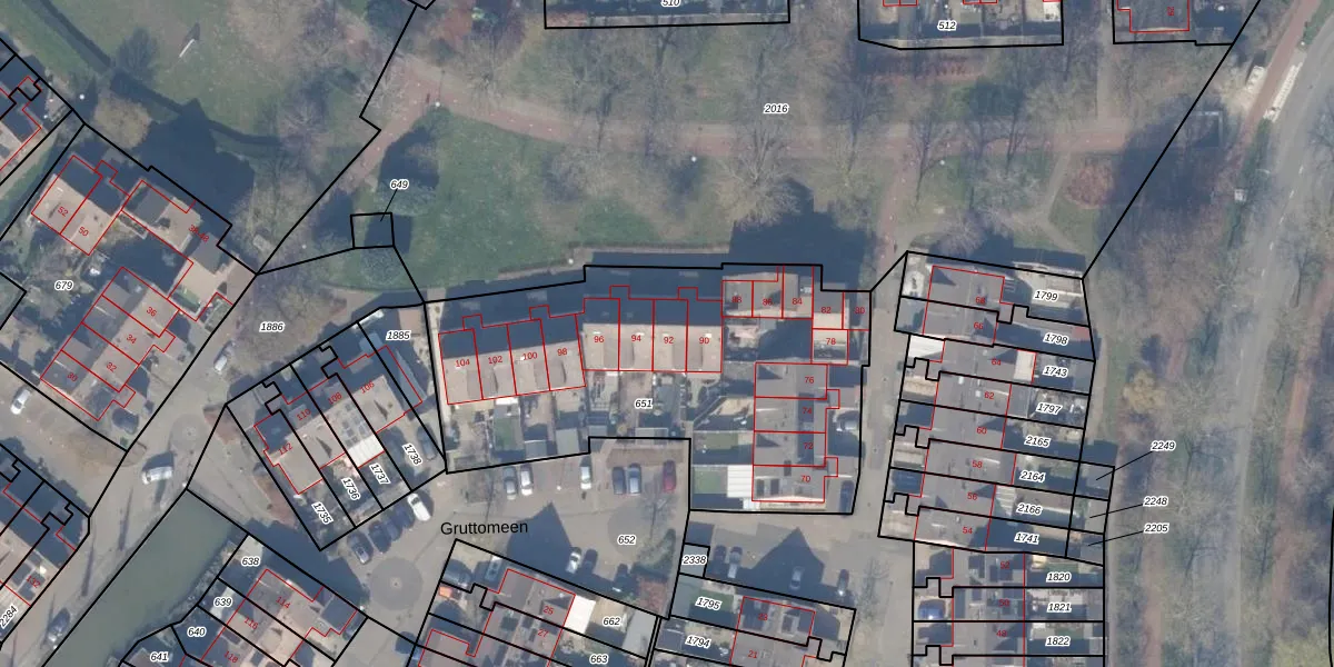 Het perceel waarop Gruttomeen 92 staat heeft een oppervlakte van 1919 m². Dit is een zeer groot perceel. De perceeloppervlakte wordt geregistreerd door het Kadaster. Gedetailleerde informatie over de maten van dit perceel kunt u vinden in het rapport Kadastrale kaart met maatvoering van Gruttomeen 92.