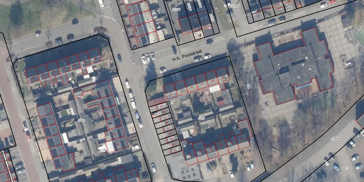 Het perceel waarop H.K. Pootstraat 4 staat heeft een oppervlakte van 2947 m². Dit is een zeer groot perceel. De perceeloppervlakte wordt geregistreerd door het Kadaster. Gedetailleerde informatie over de maten van dit perceel kunt u vinden in het rapport Kadastrale kaart met maatvoering van H.K. Pootstraat 4.