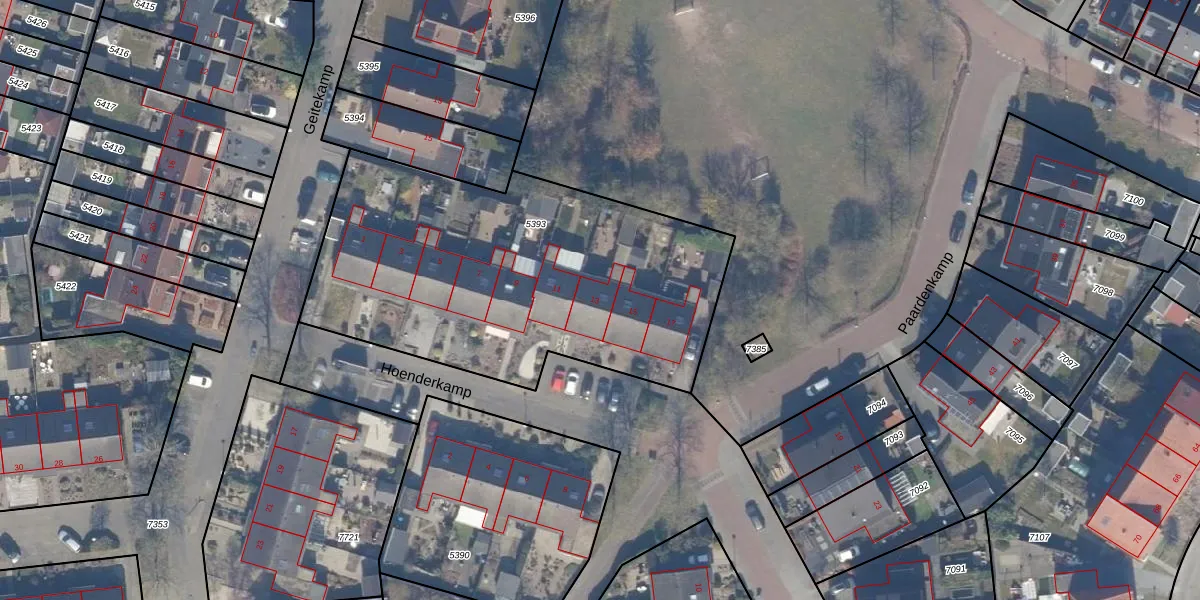 Het perceel waarop Hoenderkamp 13 staat heeft een oppervlakte van 1962 m². Dit is een zeer groot perceel. De perceeloppervlakte wordt geregistreerd door het Kadaster. Gedetailleerde informatie over de maten van dit perceel kunt u vinden in het rapport Kadastrale kaart met maatvoering van Hoenderkamp 13.