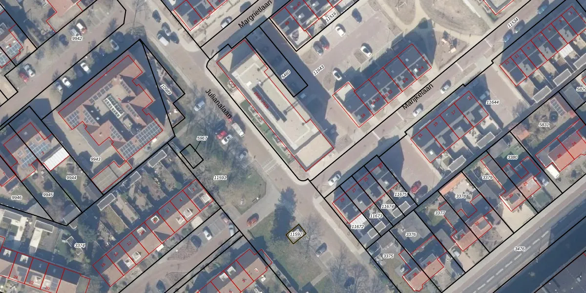 Het perceel waarop Julianalaan 15-05 staat heeft een oppervlakte van 5054 m². Dit is een zeer groot perceel. De perceeloppervlakte wordt geregistreerd door het Kadaster. Gedetailleerde informatie over de maten van dit perceel kunt u vinden in het rapport Kadastrale kaart met maatvoering van Julianalaan 15-05.