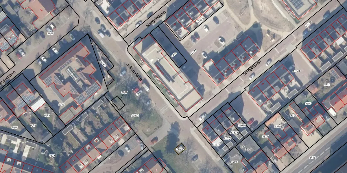 Het perceel waarop Julianalaan 15-09 staat heeft een oppervlakte van 5054 m². Dit is een zeer groot perceel. De perceeloppervlakte wordt geregistreerd door het Kadaster. Gedetailleerde informatie over de maten van dit perceel kunt u vinden in het rapport Kadastrale kaart met maatvoering van Julianalaan 15-09.