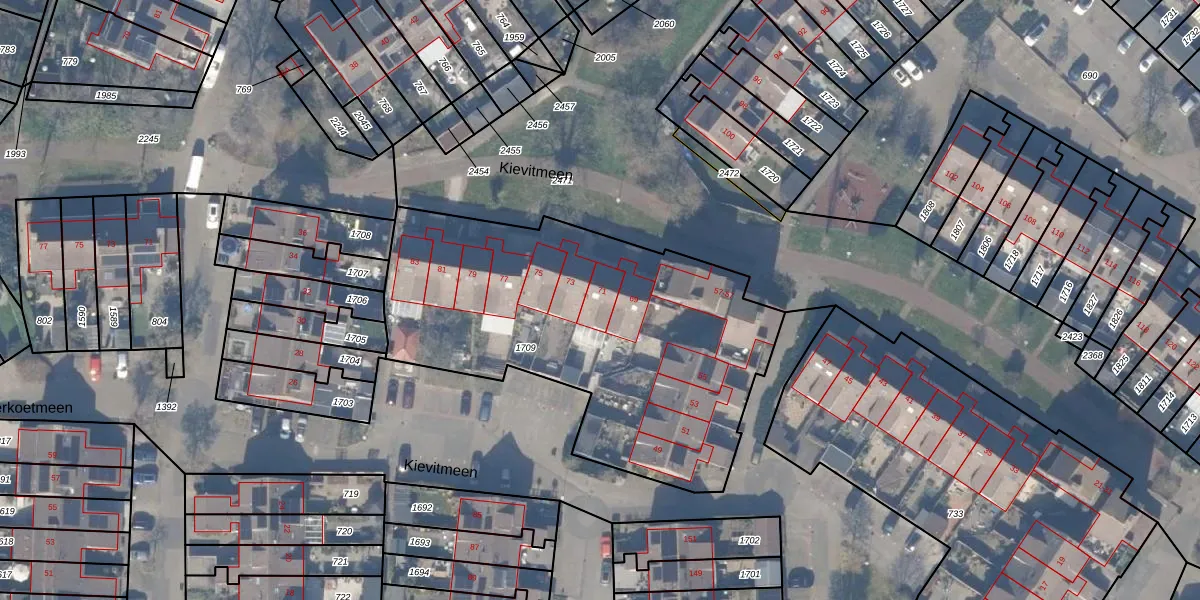 Het perceel waarop Kievitmeen 71 staat heeft een oppervlakte van 1904 m². Dit is een zeer groot perceel. De perceeloppervlakte wordt geregistreerd door het Kadaster. Gedetailleerde informatie over de maten van dit perceel kunt u vinden in het rapport Kadastrale kaart met maatvoering van Kievitmeen 71.