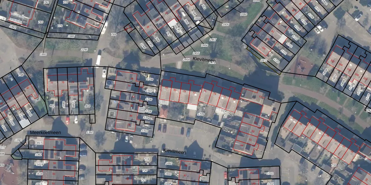 Het perceel waarop Kievitmeen 79 staat heeft een oppervlakte van 1904 m². Dit is een zeer groot perceel. De perceeloppervlakte wordt geregistreerd door het Kadaster. Gedetailleerde informatie over de maten van dit perceel kunt u vinden in het rapport Kadastrale kaart met maatvoering van Kievitmeen 79.
