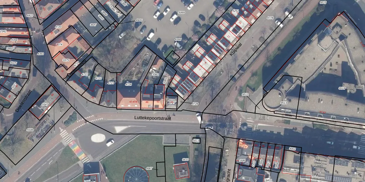 Het perceel waarop Kuipwal 1 staat heeft een oppervlakte van 1506 m². Dit is een zeer groot perceel. De perceeloppervlakte wordt geregistreerd door het Kadaster. Gedetailleerde informatie over de maten van dit perceel kunt u vinden in het rapport Kadastrale kaart met maatvoering van Kuipwal 1.