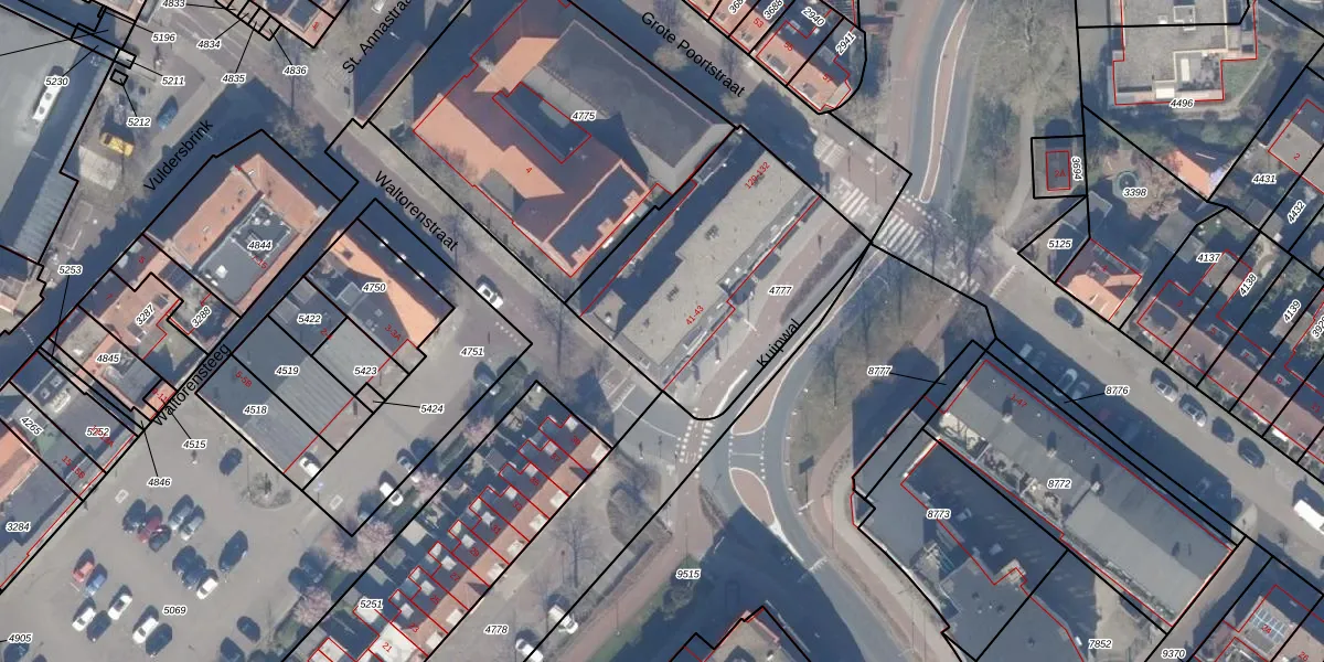 Het perceel waarop Kuipwal 41 staat heeft een oppervlakte van 1052 m². Dit is een zeer groot perceel. De perceeloppervlakte wordt geregistreerd door het Kadaster. Gedetailleerde informatie over de maten van dit perceel kunt u vinden in het rapport Kadastrale kaart met maatvoering van Kuipwal 41.