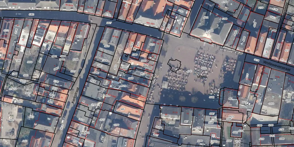 Het perceel waarop Markt 16-B staat heeft een oppervlakte van 73 m². Dit is een klein perceel. De perceeloppervlakte wordt geregistreerd door het Kadaster. Gedetailleerde informatie over de maten van dit perceel kunt u vinden in het rapport Kadastrale kaart met maatvoering van Markt 16-B.