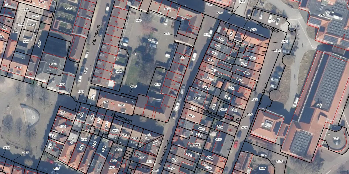 Het perceel waarop Nonnenstraat 19 staat heeft een oppervlakte van 704 m². Dit is een groot perceel. De perceeloppervlakte wordt geregistreerd door het Kadaster. Gedetailleerde informatie over de maten van dit perceel kunt u vinden in het rapport Kadastrale kaart met maatvoering van Nonnenstraat 19.