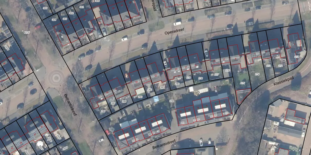 Het perceel waarop Operadreef 21 staat heeft een oppervlakte van 275 m². Dit is een middelgroot perceel. De perceeloppervlakte wordt geregistreerd door het Kadaster. Gedetailleerde informatie over de maten van dit perceel kunt u vinden in het rapport Kadastrale kaart met maatvoering van Operadreef 21.
