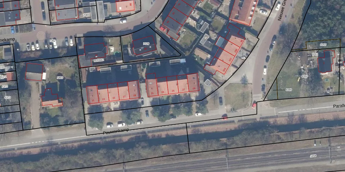 Het perceel waarop Pauwenkamp 25 staat heeft een oppervlakte van 8545 m². Dit is een zeer groot perceel. De perceeloppervlakte wordt geregistreerd door het Kadaster. Gedetailleerde informatie over de maten van dit perceel kunt u vinden in het rapport Kadastrale kaart met maatvoering van Pauwenkamp 25.