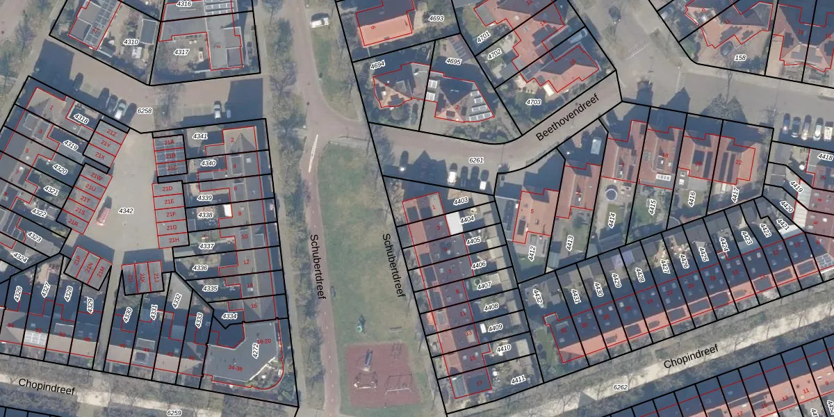 Gebruik de zoekbalk of klik op een perceel voor informatie over de adressen binnen dit perceel.