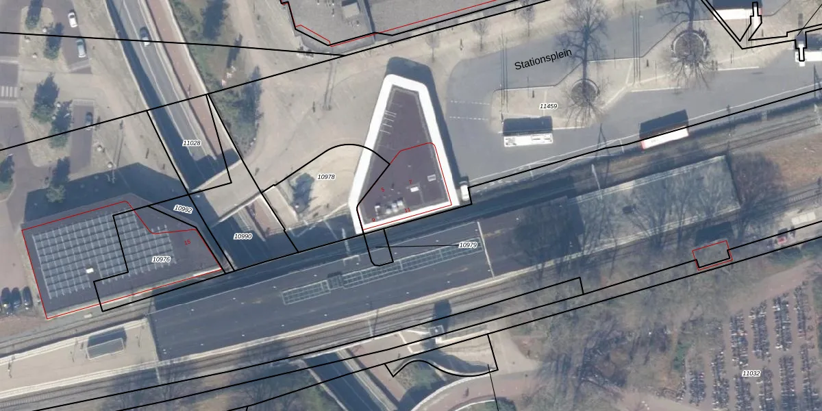 Het perceel waarop Stationsplein 11 staat heeft een oppervlakte van 4845 m². Dit is een zeer groot perceel. De perceeloppervlakte wordt geregistreerd door het Kadaster. Gedetailleerde informatie over de maten van dit perceel kunt u vinden in het rapport Kadastrale kaart met maatvoering van Stationsplein 11.