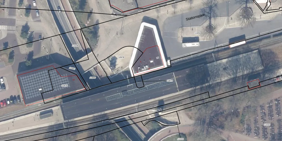 Het perceel waarop Stationsplein 9 staat heeft een oppervlakte van 4845 m². Dit is een zeer groot perceel. De perceeloppervlakte wordt geregistreerd door het Kadaster. Gedetailleerde informatie over de maten van dit perceel kunt u vinden in het rapport Kadastrale kaart met maatvoering van Stationsplein 9.