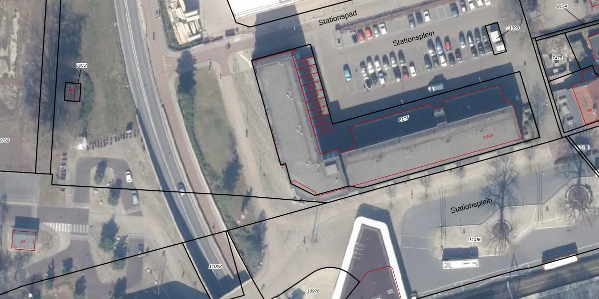 Het perceel waarop Stationsplein 94 staat heeft een oppervlakte van 2468 m². Dit is een zeer groot perceel. De perceeloppervlakte wordt geregistreerd door het Kadaster. Gedetailleerde informatie over de maten van dit perceel kunt u vinden in het rapport Kadastrale kaart met maatvoering van Stationsplein 94.