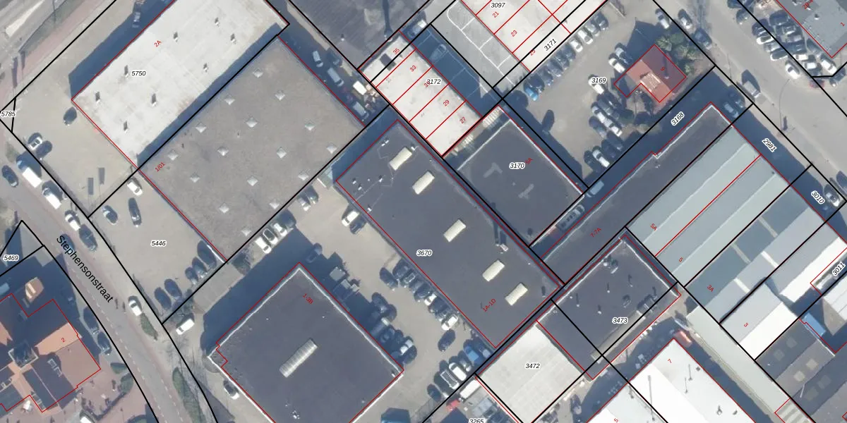 Het perceel waarop Stephensonstraat 1-B staat heeft een oppervlakte van 5015 m². Dit is een zeer groot perceel. De perceeloppervlakte wordt geregistreerd door het Kadaster. Gedetailleerde informatie over de maten van dit perceel kunt u vinden in het rapport Kadastrale kaart met maatvoering van Stephensonstraat 1-B.