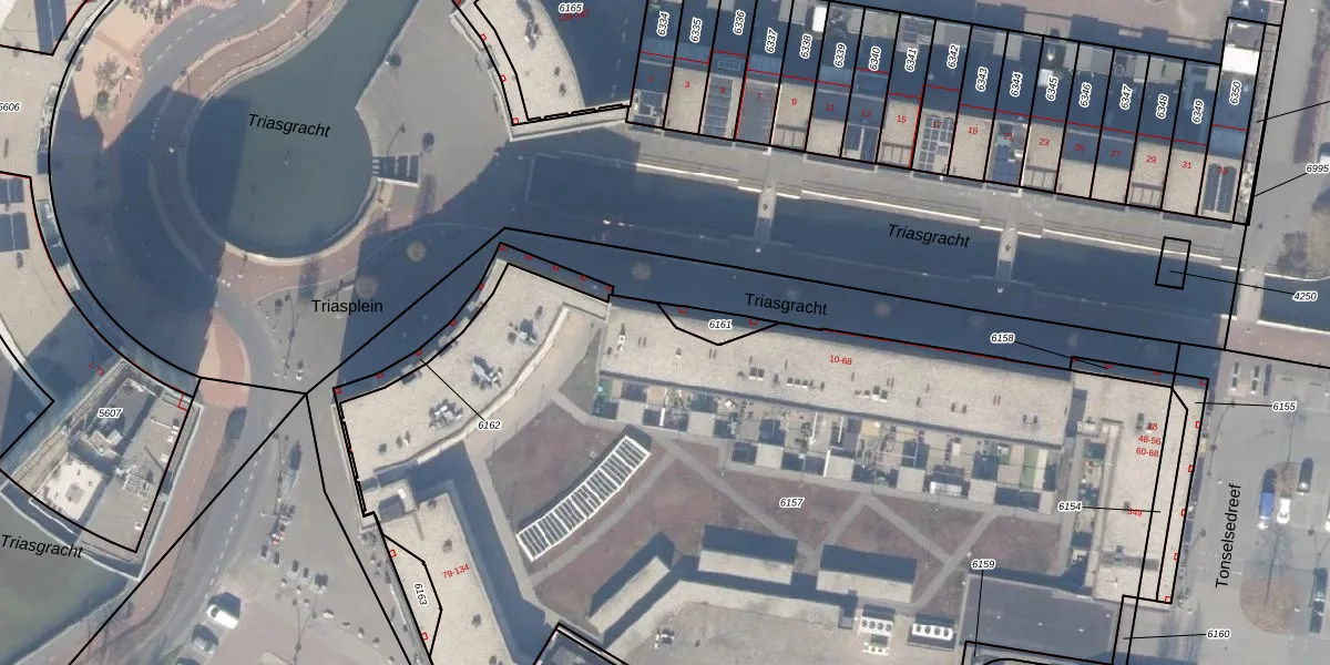 Het perceel waarop Triasgracht 24 staat heeft een oppervlakte van 6065 m². Dit is een zeer groot perceel. De perceeloppervlakte wordt geregistreerd door het Kadaster. Gedetailleerde informatie over de maten van dit perceel kunt u vinden in het rapport Kadastrale kaart met maatvoering van Triasgracht 24.