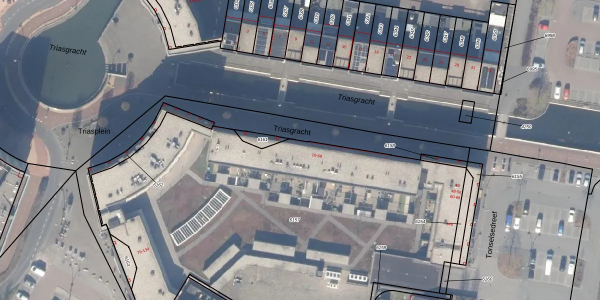 Het perceel waarop Triasgracht 32 staat heeft een oppervlakte van 6065 m². Dit is een zeer groot perceel. De perceeloppervlakte wordt geregistreerd door het Kadaster. Gedetailleerde informatie over de maten van dit perceel kunt u vinden in het rapport Kadastrale kaart met maatvoering van Triasgracht 32.