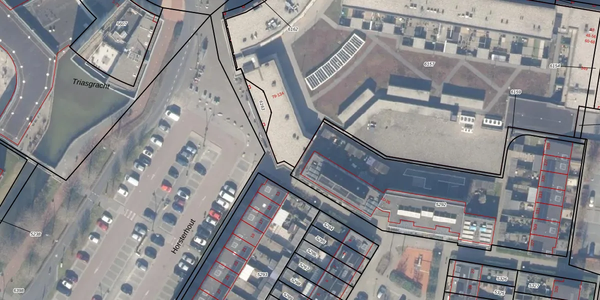 Het perceel waarop Triasplein 111 staat heeft een oppervlakte van 6065 m². Dit is een zeer groot perceel. De perceeloppervlakte wordt geregistreerd door het Kadaster. Gedetailleerde informatie over de maten van dit perceel kunt u vinden in het rapport Kadastrale kaart met maatvoering van Triasplein 111.