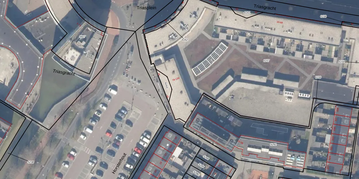 Het perceel waarop Triasplein 113 staat heeft een oppervlakte van 6065 m². Dit is een zeer groot perceel. De perceeloppervlakte wordt geregistreerd door het Kadaster. Gedetailleerde informatie over de maten van dit perceel kunt u vinden in het rapport Kadastrale kaart met maatvoering van Triasplein 113.