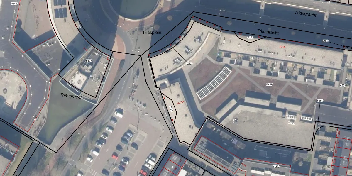 Het perceel waarop Triasplein 115 staat heeft een oppervlakte van 6065 m². Dit is een zeer groot perceel. De perceeloppervlakte wordt geregistreerd door het Kadaster. Gedetailleerde informatie over de maten van dit perceel kunt u vinden in het rapport Kadastrale kaart met maatvoering van Triasplein 115.