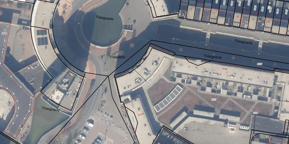 Het perceel waarop Triasplein 123 staat heeft een oppervlakte van 6065 m². Dit is een zeer groot perceel. De perceeloppervlakte wordt geregistreerd door het Kadaster. Gedetailleerde informatie over de maten van dit perceel kunt u vinden in het rapport Kadastrale kaart met maatvoering van Triasplein 123.
