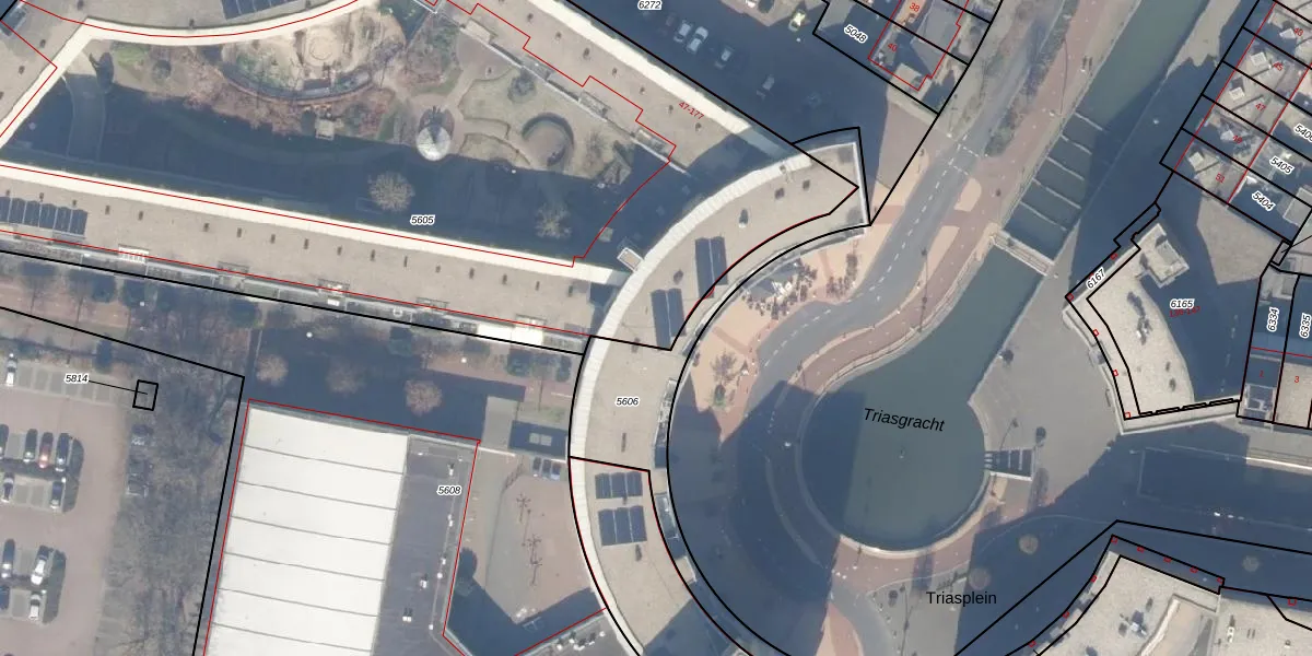 Het perceel waarop Triasplein 15 staat heeft een oppervlakte van 6542 m². Dit is een zeer groot perceel. De perceeloppervlakte wordt geregistreerd door het Kadaster. Gedetailleerde informatie over de maten van dit perceel kunt u vinden in het rapport Kadastrale kaart met maatvoering van Triasplein 15.