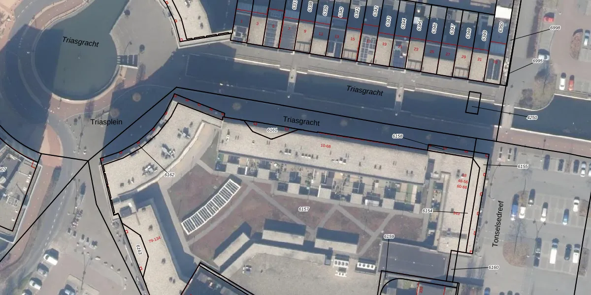 Het perceel waarop Triasplein 87 staat heeft een oppervlakte van 6065 m². Dit is een zeer groot perceel. De perceeloppervlakte wordt geregistreerd door het Kadaster. Gedetailleerde informatie over de maten van dit perceel kunt u vinden in het rapport Kadastrale kaart met maatvoering van Triasplein 87.