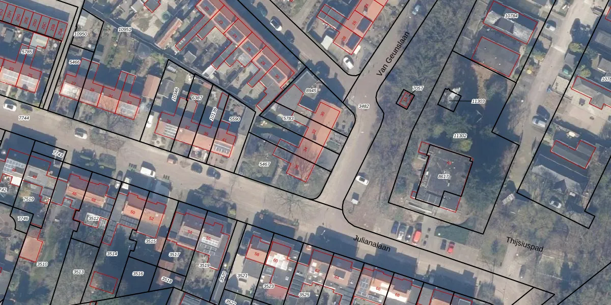 Het perceel waarop Van Geunslaan 34 staat heeft een oppervlakte van 6430 m². Dit is een zeer groot perceel. De perceeloppervlakte wordt geregistreerd door het Kadaster. Gedetailleerde informatie over de maten van dit perceel kunt u vinden in het rapport Kadastrale kaart met maatvoering van Van Geunslaan 34.