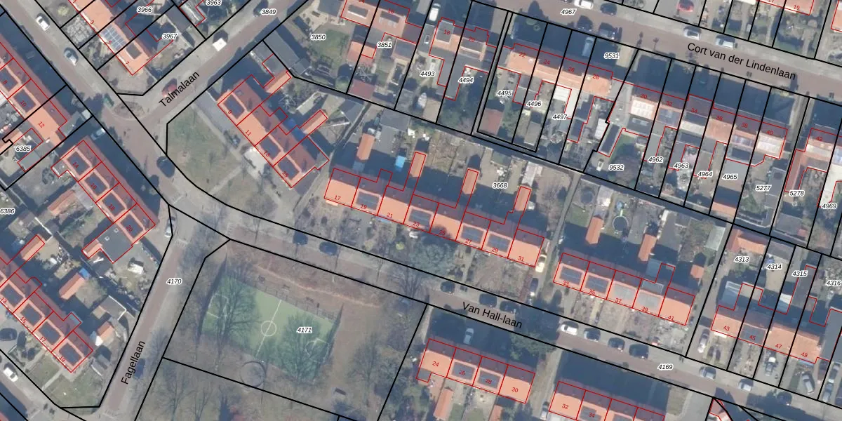 Het perceel waarop Van Hall-laan 23 staat heeft een oppervlakte van 4405 m². Dit is een zeer groot perceel. De perceeloppervlakte wordt geregistreerd door het Kadaster. Gedetailleerde informatie over de maten van dit perceel kunt u vinden in het rapport Kadastrale kaart met maatvoering van Van Hall-laan 23.