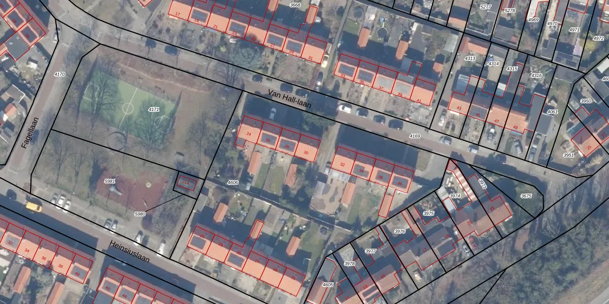 Het perceel waarop Van Hall-laan 30 staat heeft een oppervlakte van 3588 m². Dit is een zeer groot perceel. De perceeloppervlakte wordt geregistreerd door het Kadaster. Gedetailleerde informatie over de maten van dit perceel kunt u vinden in het rapport Kadastrale kaart met maatvoering van Van Hall-laan 30.