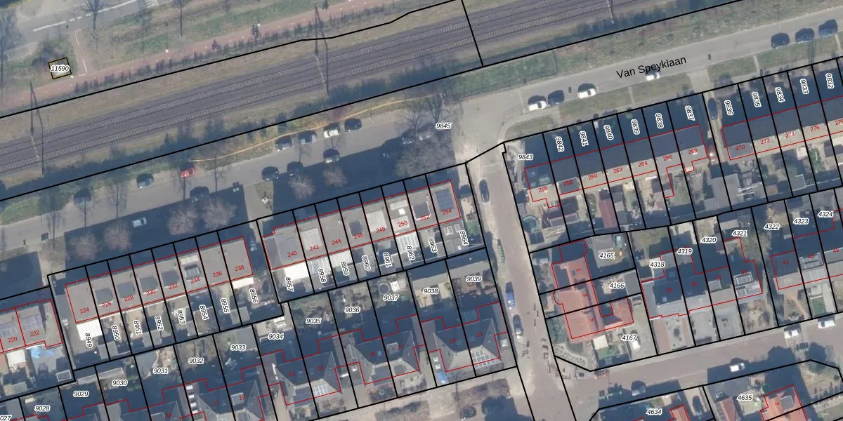 Het perceel waarop Van Speyklaan 252 staat heeft een oppervlakte van 112 m². Dit is een middelgroot perceel. De perceeloppervlakte wordt geregistreerd door het Kadaster. Gedetailleerde informatie over de maten van dit perceel kunt u vinden in het rapport Kadastrale kaart met maatvoering van Van Speyklaan 252.