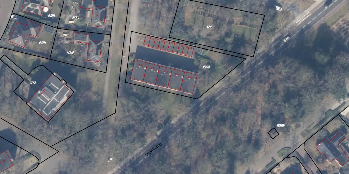 Het perceel waarop Veldkamp 12 staat heeft een oppervlakte van 1605 m². Dit is een zeer groot perceel. De perceeloppervlakte wordt geregistreerd door het Kadaster. Gedetailleerde informatie over de maten van dit perceel kunt u vinden in het rapport Kadastrale kaart met maatvoering van Veldkamp 12.