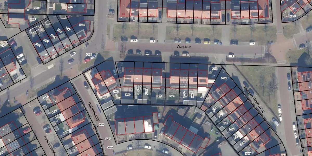 Het perceel waarop Walstein 70 staat heeft een oppervlakte van 245 m². Dit is een middelgroot perceel. De perceeloppervlakte wordt geregistreerd door het Kadaster. Gedetailleerde informatie over de maten van dit perceel kunt u vinden in het rapport Kadastrale kaart met maatvoering van Walstein 70.