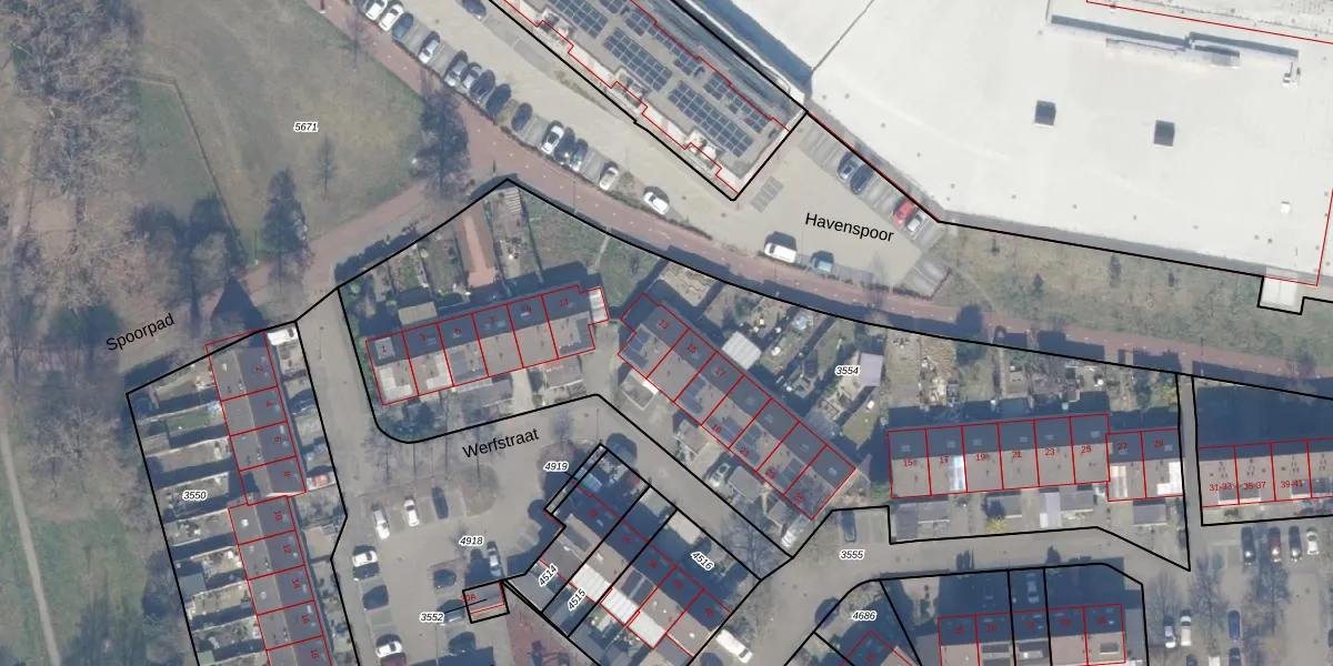 Het perceel waarop Werfstraat 13 staat heeft een oppervlakte van 3660 m². Dit is een zeer groot perceel. De perceeloppervlakte wordt geregistreerd door het Kadaster. Gedetailleerde informatie over de maten van dit perceel kunt u vinden in het rapport Kadastrale kaart met maatvoering van Werfstraat 13.