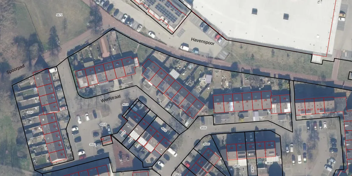 Het perceel waarop Werfstraat 19 staat heeft een oppervlakte van 3660 m². Dit is een zeer groot perceel. De perceeloppervlakte wordt geregistreerd door het Kadaster. Gedetailleerde informatie over de maten van dit perceel kunt u vinden in het rapport Kadastrale kaart met maatvoering van Werfstraat 19.
